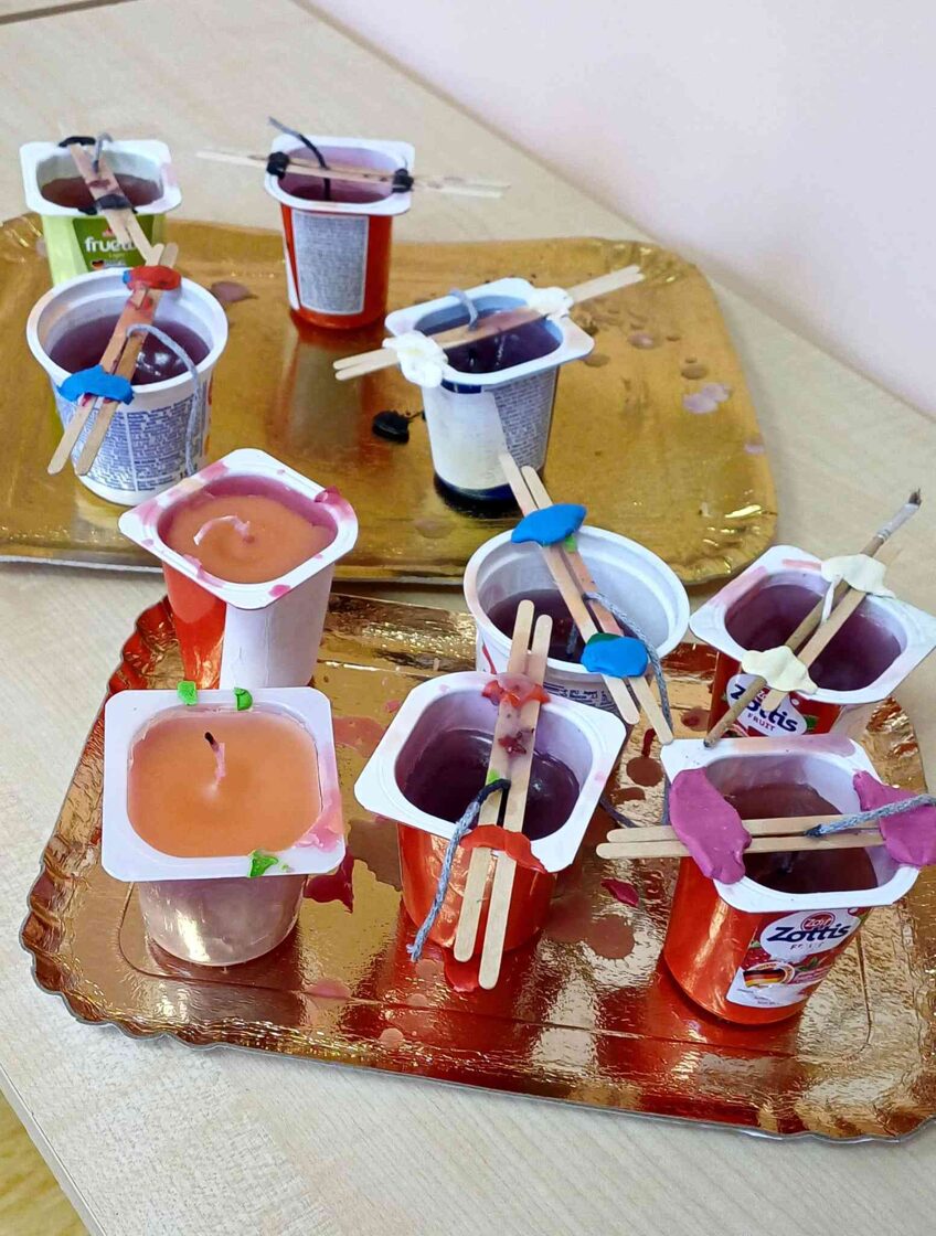Mēs zinām, ka ir dažādas iespējas nopirkt gan formiņas, gan aromātiskās eļļas. Šoreiz turpinājām iesākto tradīciju un izmantojām otrreizējos materiālus - jogurta trauciņus un daļēji nodegušu sveču galus, lai pēc iespējas mazāk vidē nonāktu atkritumi.