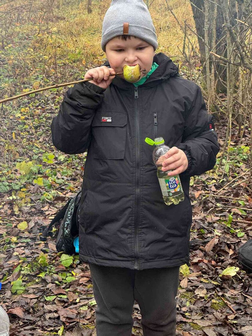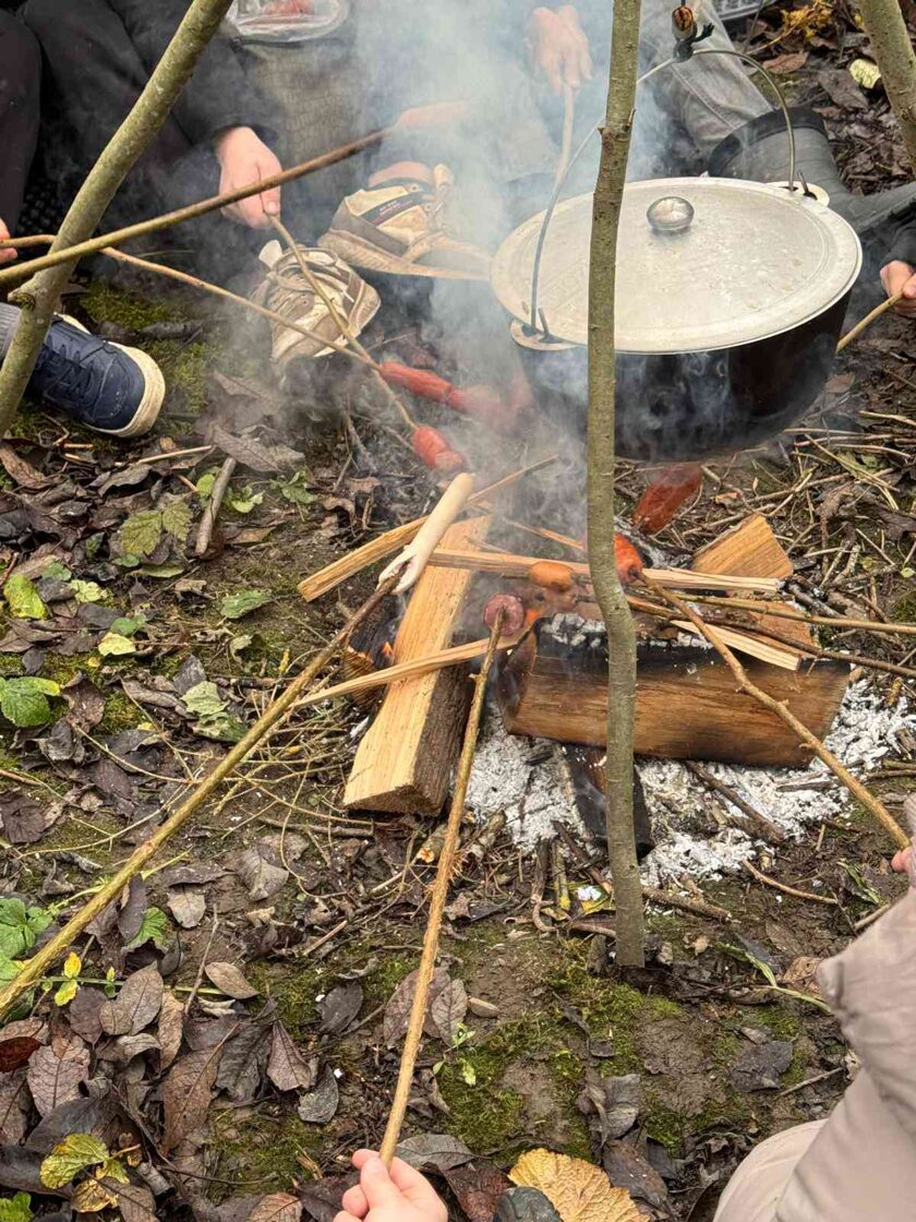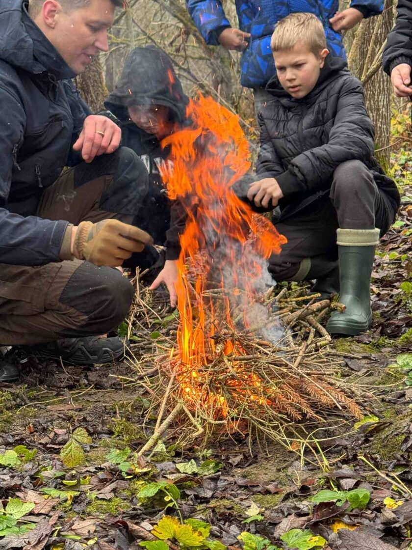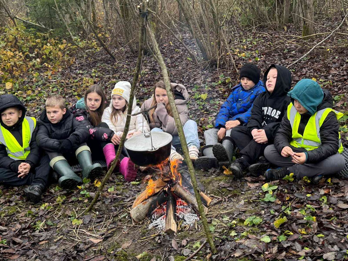 Kad prasmes bija apgūtas, visus gaidīja silta atpūta pie ugunskura – “smurfu tēja” no egļu zariem, līdzi paņemtās desiņas un nesteidzīgas sarunas draugu lokā. Šis brīdis ļāva izbaudīt kopā būšanu, siltumu un patīkamo nogurumu pēc labi padarīta darba.