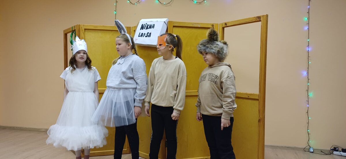 No tuvām un tālām zemēm ieradās krāšņos tērpos ģērbti viesi. Veiklā Sniegpārsliņa, vieglā deju solī virpuļojot, apklāja pasaku valstību ar baltu sniedziņu. Viņa nomierināja satrauktos zaķēnu, lapsēnu un lācēnu, kuri nezināja, kas ir Ziemassvētki.